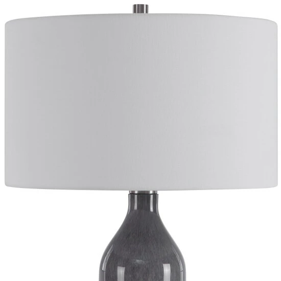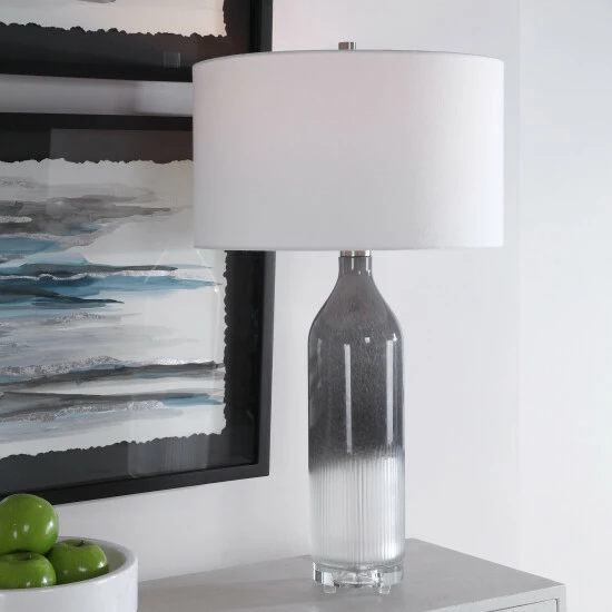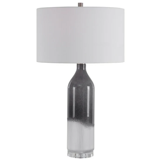 Perfect for any room style, this art glass table lamp features a transitional style with an light grey and frosted white ombre look, displayed on a thick crystal foot accented with brushed nickel details. The lamp is paired with a white fabric drum shade.