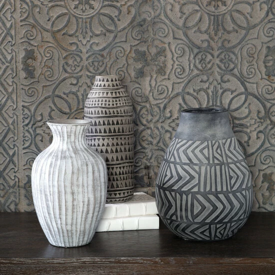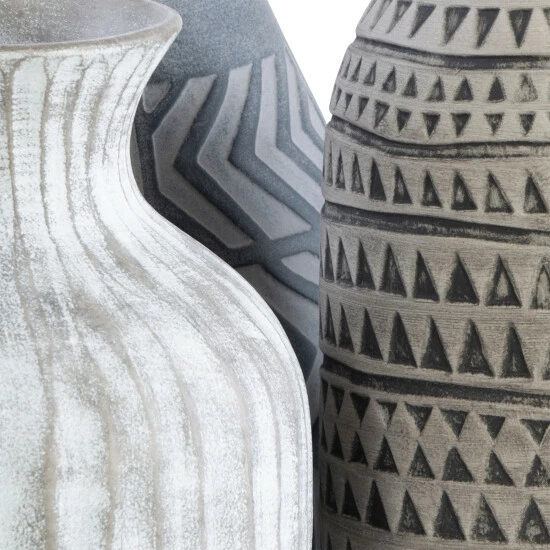 Set of three earthenware vases are finished in light grey, charcoal, and natural beige with etched geometric patterns.