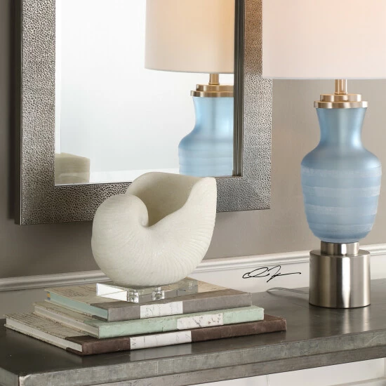 An over-sized nautilus shell, cast with a granular stone textured finish and set on a crystal base.