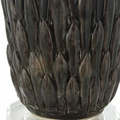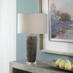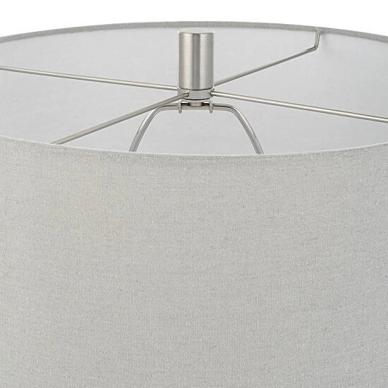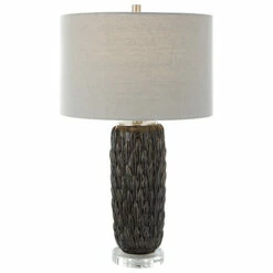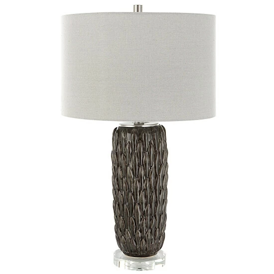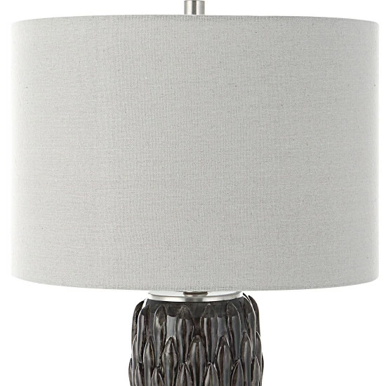 This ceramic table lamp features a deep mushroom grey glaze over carved details, accented with polished nickel plated details and an elegant crystal foot. The lamp is paired with a hardback drum shade in light grey.