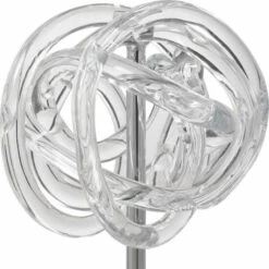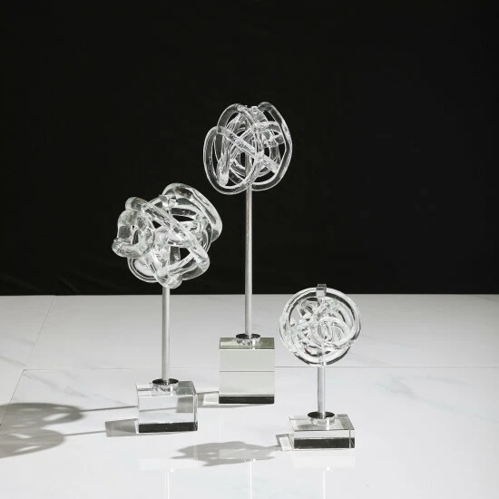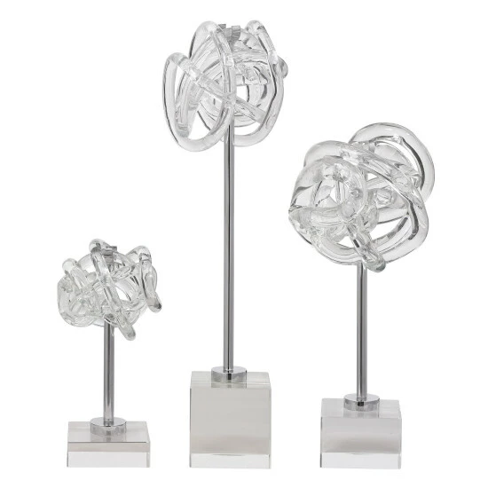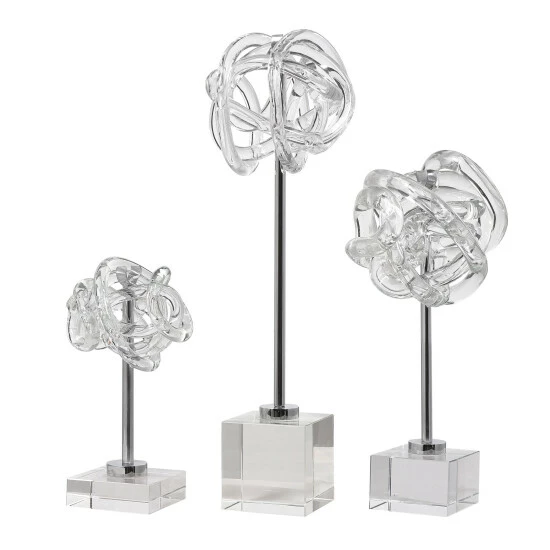 This contemporary trio features unique clear glass knot designs accented by polished nickel details and crystal bases.