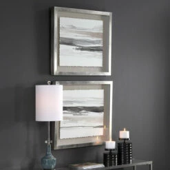 These abstract watercolors add transitional style to a space. Each piece features light grey, charcoal, and white hues on deckled parchment, set against an oatmeal linen background. Each original watercolor is placed in a champagne silver shadow box frame under protective glass. This artwork may be hung horizontal or vertical.