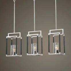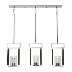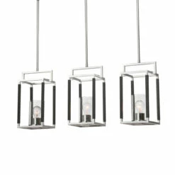 The clean geometric rectangular and square lines in polished nickel on our 3 lt linear pendant are enhanced with hand sewn textured black leather accents. 3-60 watt max, edison sockets. Supplied with 15 feet wire, 9-12 inches stems, and 3-6 inches stem for adjustable.