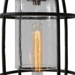 Modern, industrial style is introduced in this accent lamp design. A heavily seeded glass globe is suspended in a black metal surround, accented with plated antique brass details. One 40 watt T-30 vintage style bulb included.