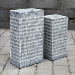 Set of two rectangular vases showcase a well-traveled look with a black and white color story and natural beige palm leaf strands that create a unique basketweave design.