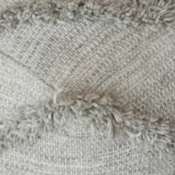 Handwoven from 100 percent wool in easy shades of grey, accented with a textured geometric fringe. Has versatile use as an ottoman, extra seating for guests, or even an accent table when topped with a decorative tray.