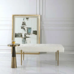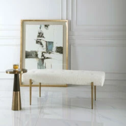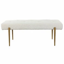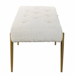 Expertly tailored in white faux shearling, this glamorous accent bench features a plush button tufted seat, atop four tapered stainless steel legs finished in antique brushed brass.