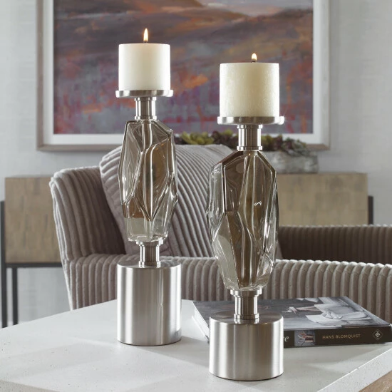 Set of two candleholders showcase a contemporary feel with geometric silver glass accents and brushed nickel finished bases.
