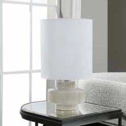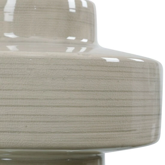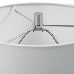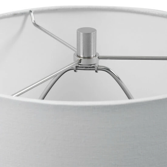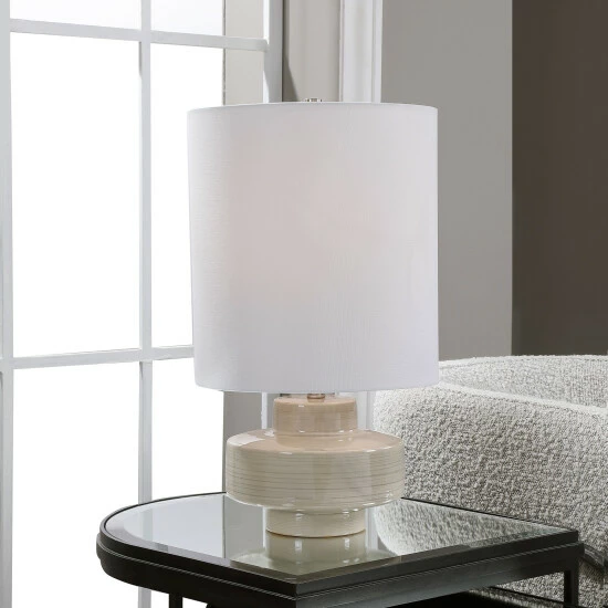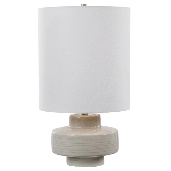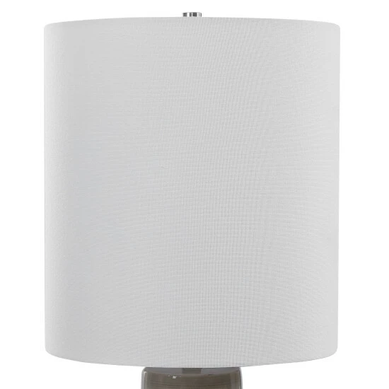 Simple yet versatile, this accent lamp is finished in a light grey crackle glaze with subtle striped accents and brushed nickel details. The lamp is paired with a white linen drum shade.