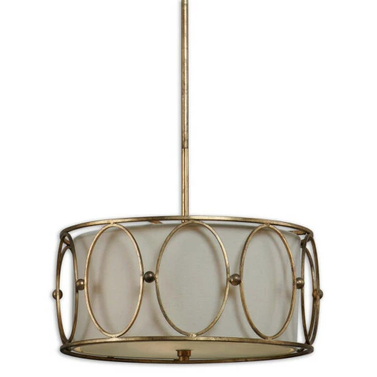 Light up your living room in a glamorous way with this unique drum pendant fixture. The metal construction makes this fixture a durable addition to your home that is designed to last. Enjoy the rustic elegance of the gold leaf finish, which pairs well with a lodge style living room. The pendant design brings movement and charm to an overhead space.