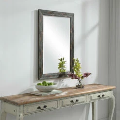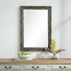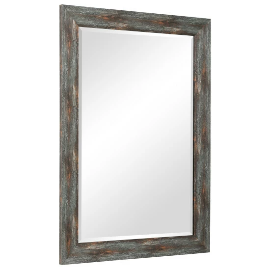 This mirror showcases a heavily burnished wash with antique silver and copper bronze undertones for a contemporary, yet rustic look. The beveled mirror may be hung horizontal or vertical.