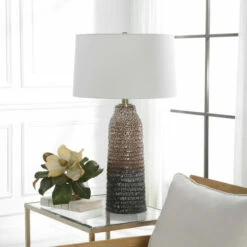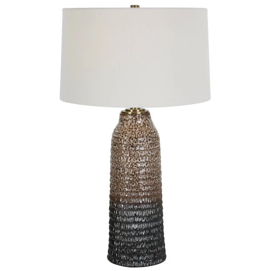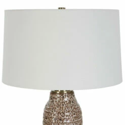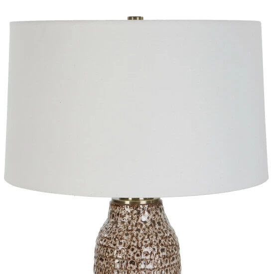This table lamp displays a unique, a carved ceramic base finished in a mottled ombre effect from aged ivory down to dark chocolate, accented with plated brushed brass details. Paired with a tapered hardback drum shade covered in a casual white linen fabric.