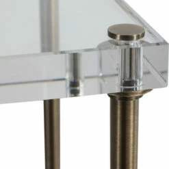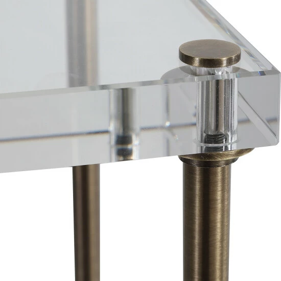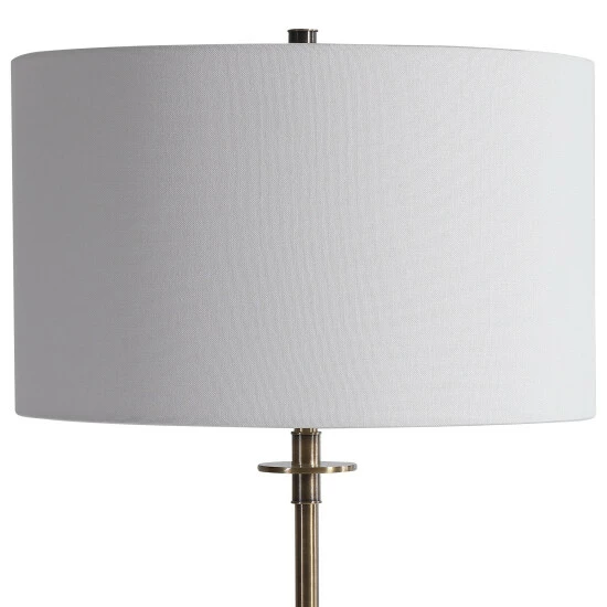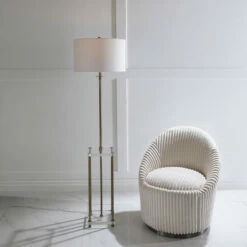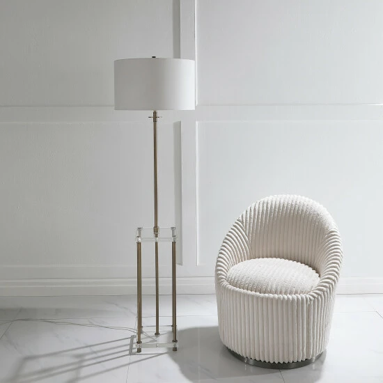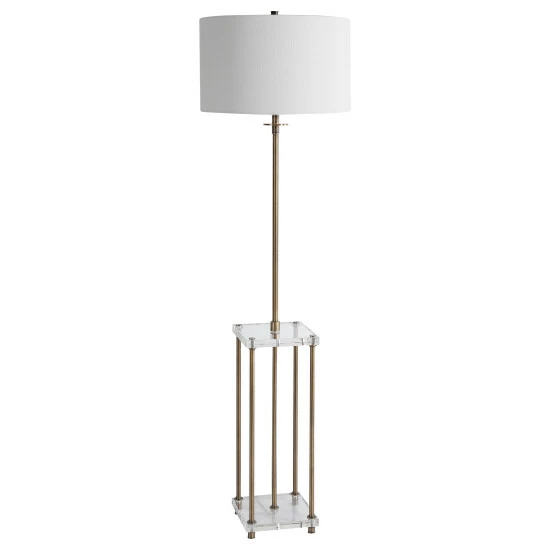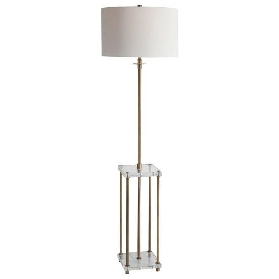 Sophisticated and elegant, this floor lamp displays a transitional look with sleek iron details finished in a plated antique brass and thick crystal shelves. The drum shade is covered in a white linen fabric.