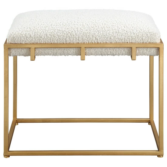 A glamorous accent, this small bench features an upscale gold leafed iron frame paired with a plush upholstered seat in a white faux shearling.