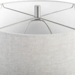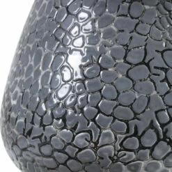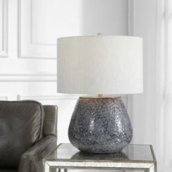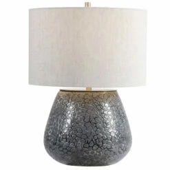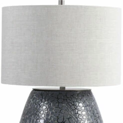 Reminiscent of natural river stones, this table lamp showcases an embossed textured ceramic base in a metallic charcoal grey finish with brushed nickel plated details. A light grey linen drum shade with natural slubbing accents the piece.