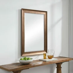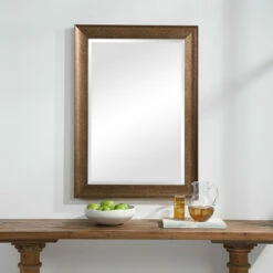 This rectangular mirror features a sloped profile finished in a distressed heavily antiqued rustic bronze with dark undertones. The piece has a 1-inch bevel and may be hung horizontal or vertical.
