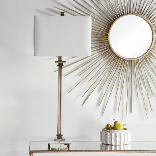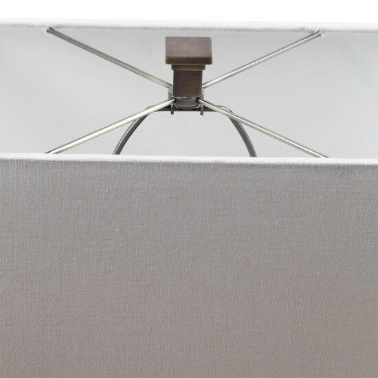 Add a touch of updated traditional style to a space with this table lamp. The metal base features a fluted design finished in a plated antique brass, accented with a thick piece of elegant crystal. The rectangle hardback shade is a white linen fabric.
