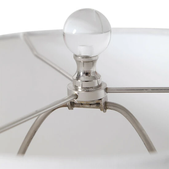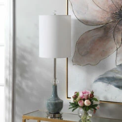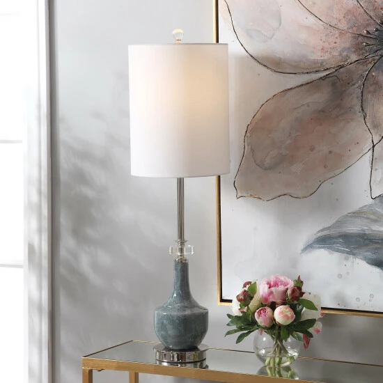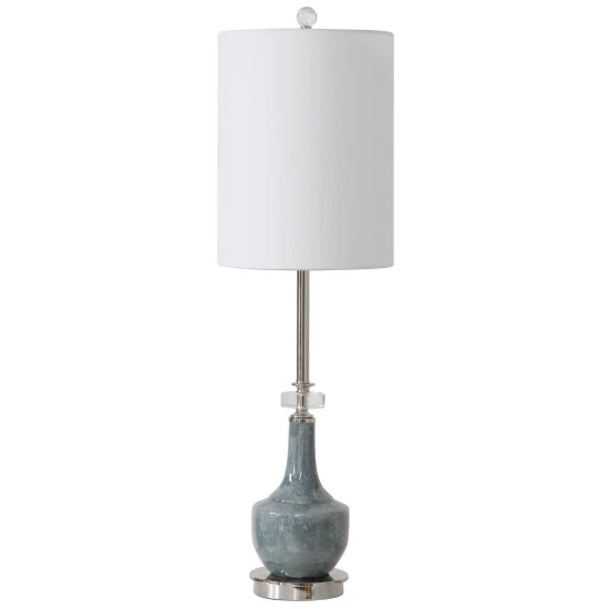 This buffet lamp features a ceramic base finished in a mottled blue glaze with subtle rust distressing, polished nickel plated details and crystal accents compliment this design. The round hardback shade is a white linen fabric.