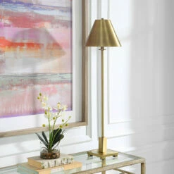 The Pilot buffet lamp displays a slender metal construction finished in plated brushed brass with a coordinating metal empire shade.