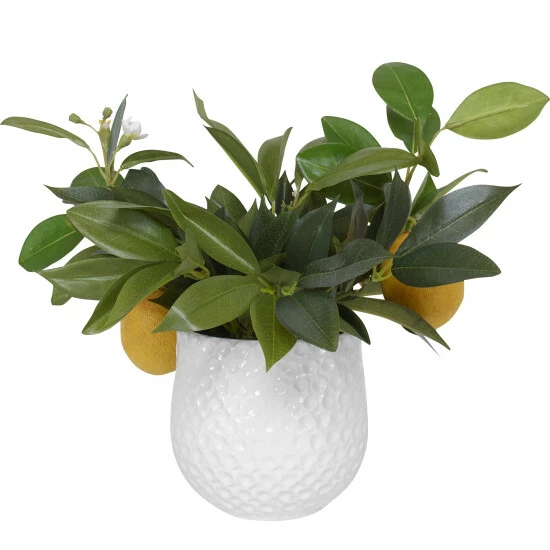 A refreshing bunch of budding lemon stems is accented by a bed of naturally preserved moss, placed in a contemporary dimpled white ceramic pot.