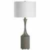 This metal lamp has a mottled dark chocolate bronze finish with brushed coffee bronze accents. The round, hardback drum shade is dark oatmeal linen fabric with chocolate bronze metal trim. The shade pivots left and right.