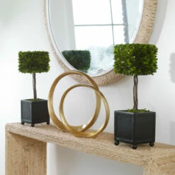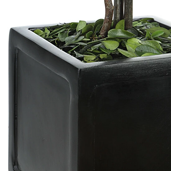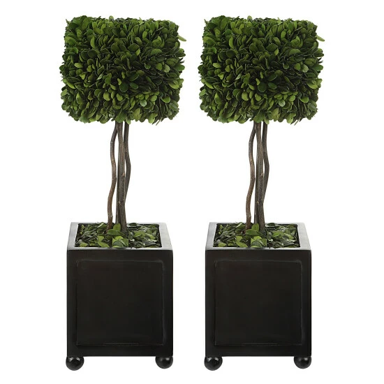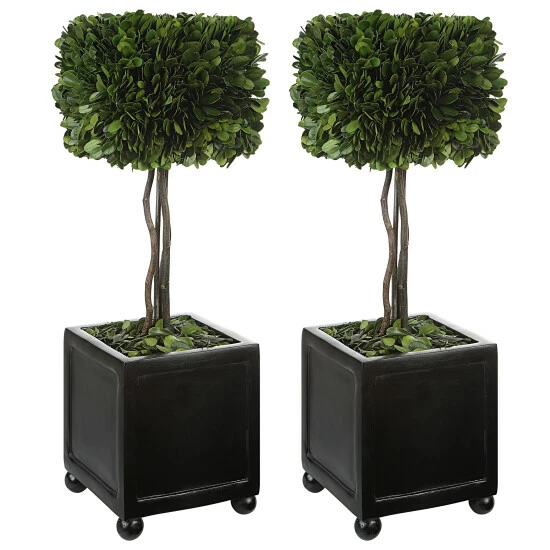 Natural evergreen foliage preserved while freshly picked, looks and feels like living boxwood. Supported by natural willow branches, two square topiaries are potted in contemporary ball footed planters finished in satin black.