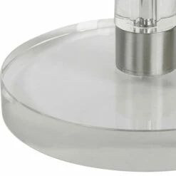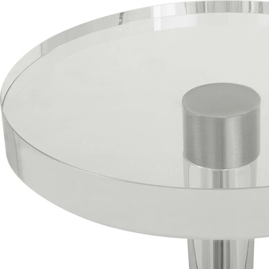 Crafted almost entirely from crystal, this drink table adds an elegant touch to any space. The tapered post is accented with iron details finished in brushed nickel.