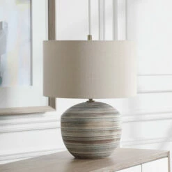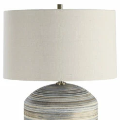 This ceramic accent lamp features a striped motif in neutral shades of brown, taupe, cream, and blue accented by light brushed brass plated details. A light beige linen drum shade with natural slubbing completes the piece.