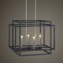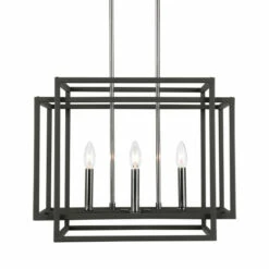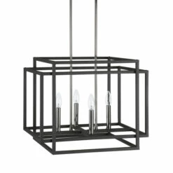 Clean rectangles in sanded black texture finish with polished nickel accents complete this 4 lt pendant. With 4-60 watt max candelabra sockets. Supplied with 15 feet wire, 6-12 inches stems, and 2-6 inches stems for adjustable installation.