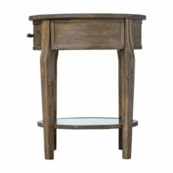 A rustic casual and versatile look, constructed from select hardwoods with a mango veneer, finished in a weathered pecan with a grey wash. Inset with antique mirrors on the top and gallery shelf, and accented with an industrial bar pull in lightly burnished iron.