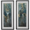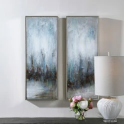 Hand painted canvases showcase mottled shades of grey and steel blue with silver and bronze highlights and are accented by silver leaf gallery frames. Due to the handcrafted nature of this artwork, each piece may have subtle differences.