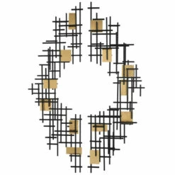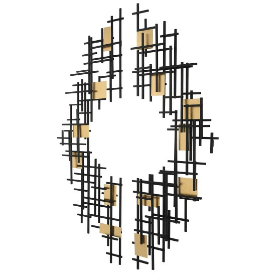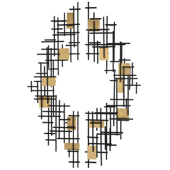 Set of two contemporary wall pieces display overlapping iron grids finished in matte black with gold leaf accents. May be hung horizontal or vertical.