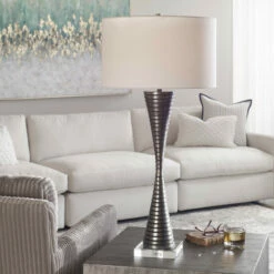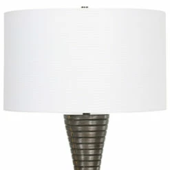 Constructed from cast iron, this table lamp features a masculine look with ribbed texture and an hourglass silhouette, displayed on a thick crystal foot. A white hardback drum shade completes the look.