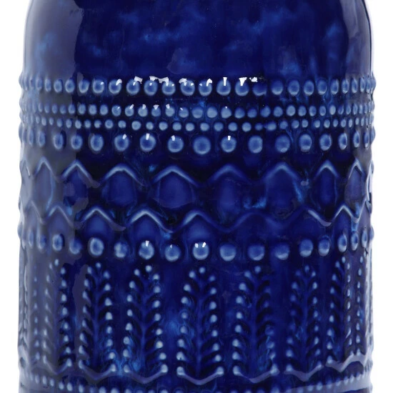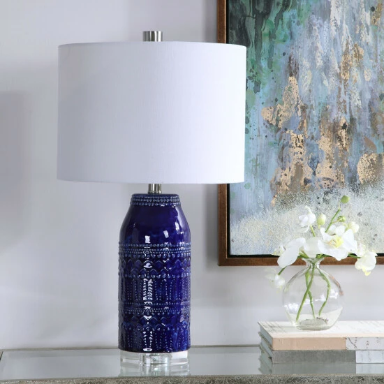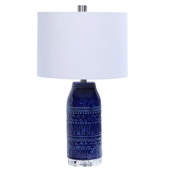 This ceramic table lamp is finished in a distressed deep blue glaze features an embossed tribal design displayed on a thick crystal foot accented with brushed nickel details. The lamp is complimented by a white fabric drum shade.
