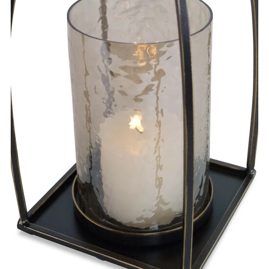 Taking cues from moroccan style, this candleholder is finished in dark bronze with gold rub-through details and a textured glass hurricane. One white 3×3 inches candle is included.