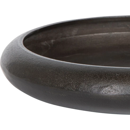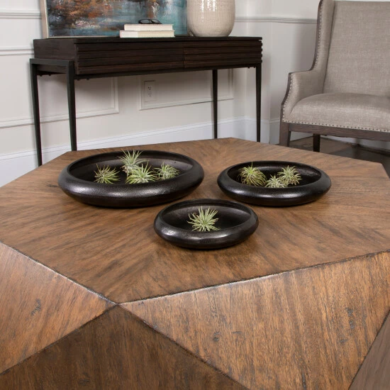 Set of three, cast aluminum trays feature a dark black nickel finish.