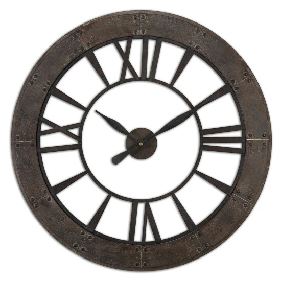 Amplify your home’s rustic atmosphere when you hang this Uttermost Ronan wall clock. Combining fir and metal, this round clock is a long-lasting accent piece. The quartz movement assures precise timekeeping using a single AA battery, while the distressed bronze and grey finishes and Roman numeral hours create a pleasant vintage aesthetic.