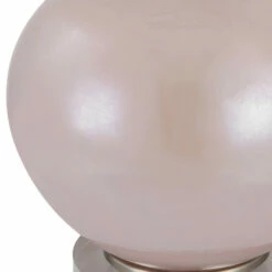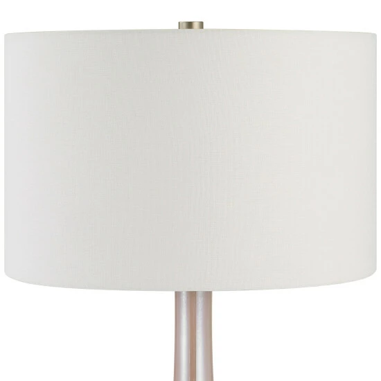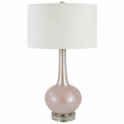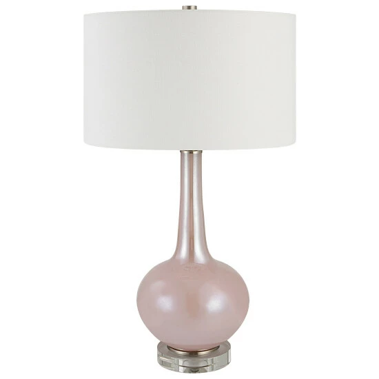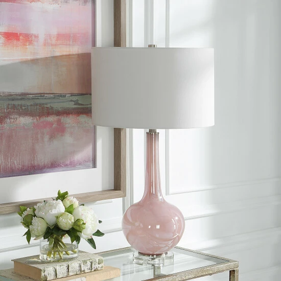 Elegant and sophisticated, the rosa table lamp showcases a light blush pink glass base with brushed nickel and crystal details. The hardback drum shade is covered in a white cotton fabric.
