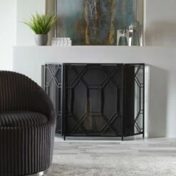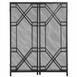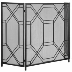 Forged iron fireplace screen features a geometric design in a satin black finish. The center panel is 26″ wide and the side panels are each 13″ wide.