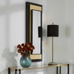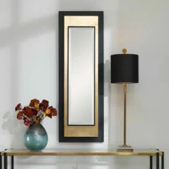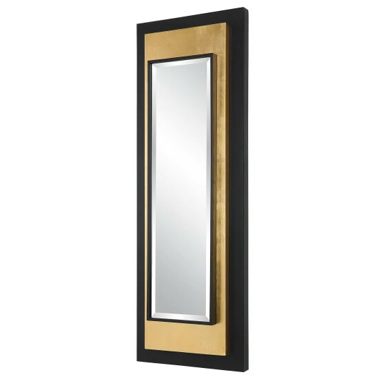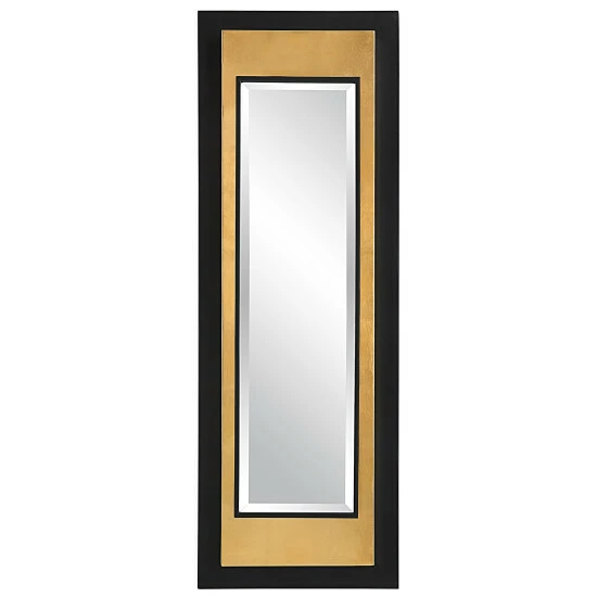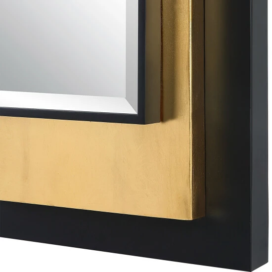 This mirror looks great alone or paired with multiples for a striking statement. The iron frame features a stacked profile with alternating finishes of a soft matte black and metallic gold leaf. Mirror may be hung horizontal or vertical.