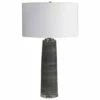 This Rovasenda table lamp is an excellent home accent with its crackled, pale mint green ceramic crafting, with grey distressing and rust undertones and accented with brushed nickel details and a crystal foot. The slightly tapered oval hardback shade is a light beige linen fabric. Due to the nature of fired glazes on ceramic lamps, the finish will vary for each piece.