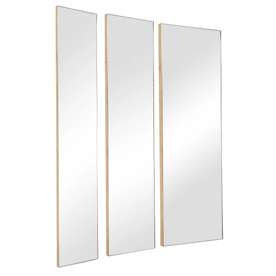 This set of three mirrors showcase simple, clean lines with gold leaf finished metal profile frames. Each mirror may be hung horizontal or vertical, allowing for multiple modern display options.