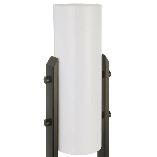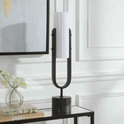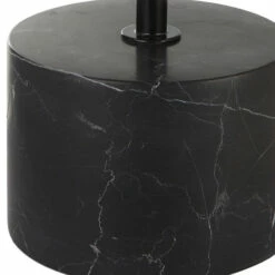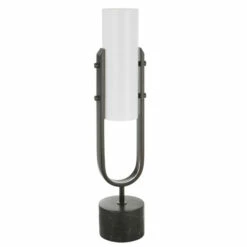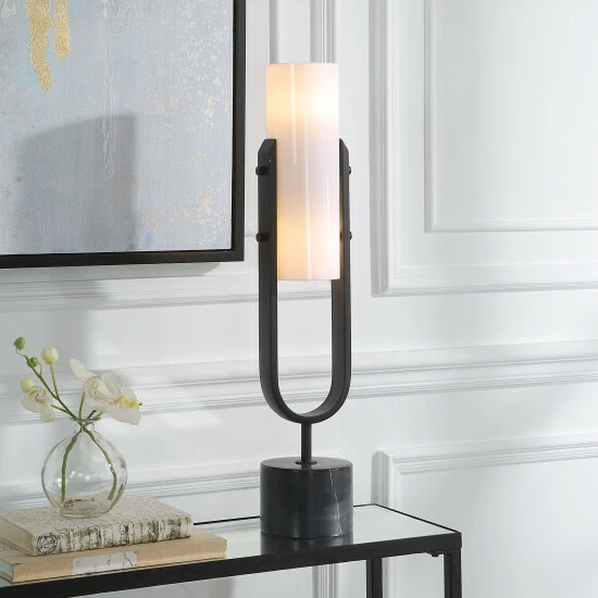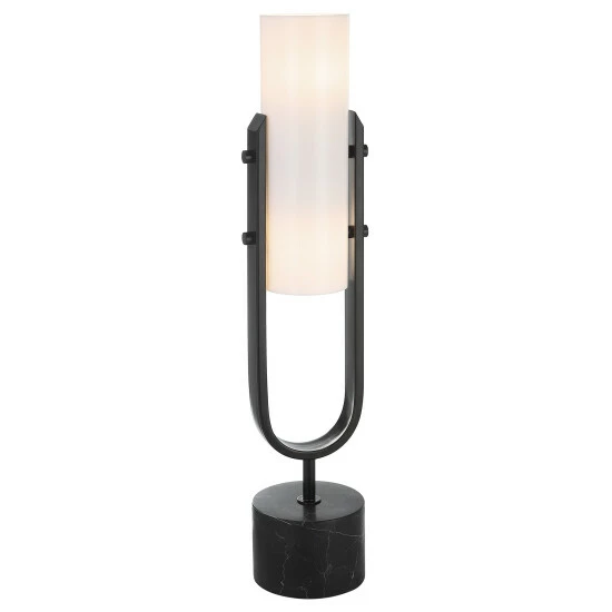 Equal parts stylish and functional, this tabletop accent features a sleek black and white design with a solid marble foot, steel body and white acrylic shade.