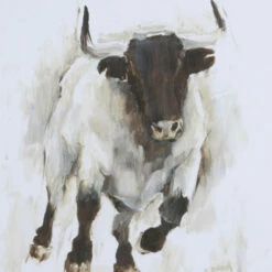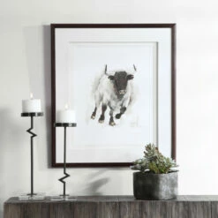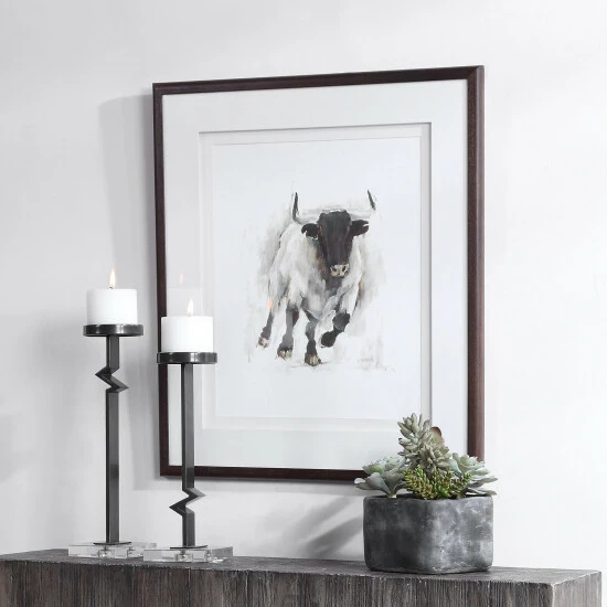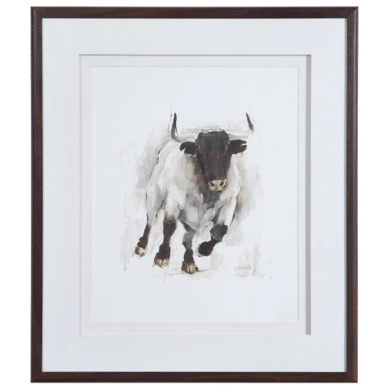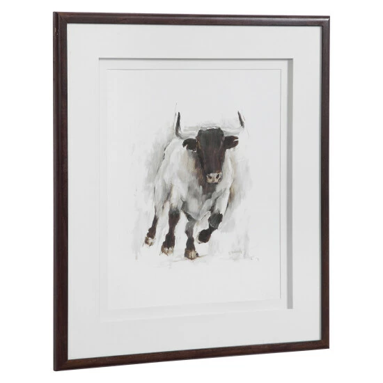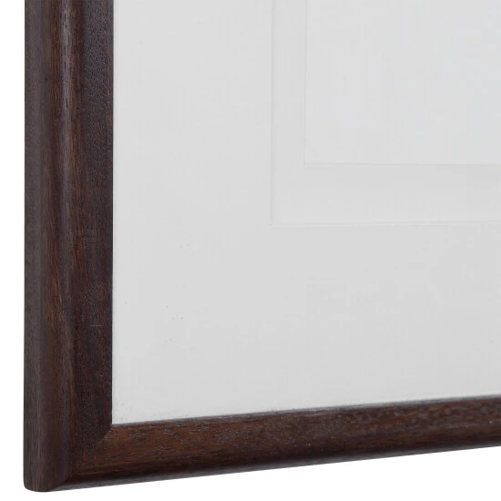 Neutral brown, white, and grey tones are used in this modern lodge style framed print. The print is complemented by double white matting with a simple wood frame and is placed under glass.