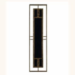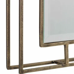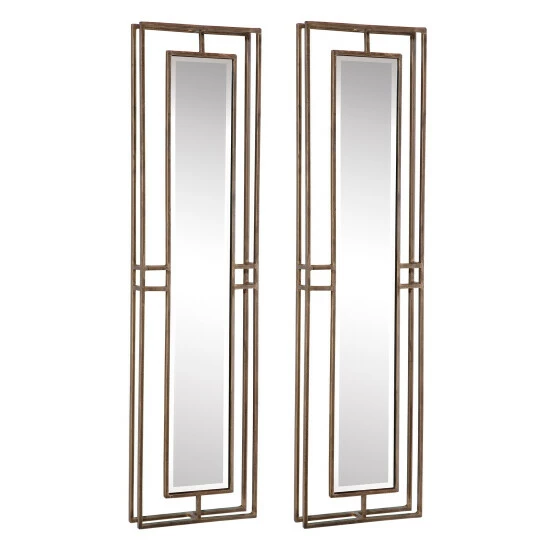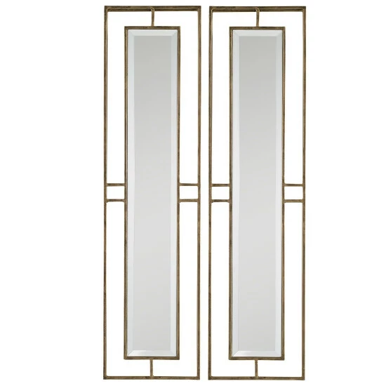 Clean and contemporary, each mirror exhibit linear metal frames with a nearly two inch open depth. Each frame is finished in a heavily antiqued gold, accented by slim beveled mirrors. May be hung horizontal or vertical.