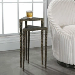 Inspired by global design and collected bohemian styles, these triangular accent tables are a conversation piece for any room. Each table features a cast iron base with a tribal texture finished in dark bronze and luxe gold tipping, topped with a textural.