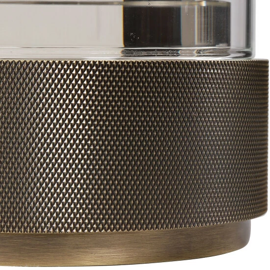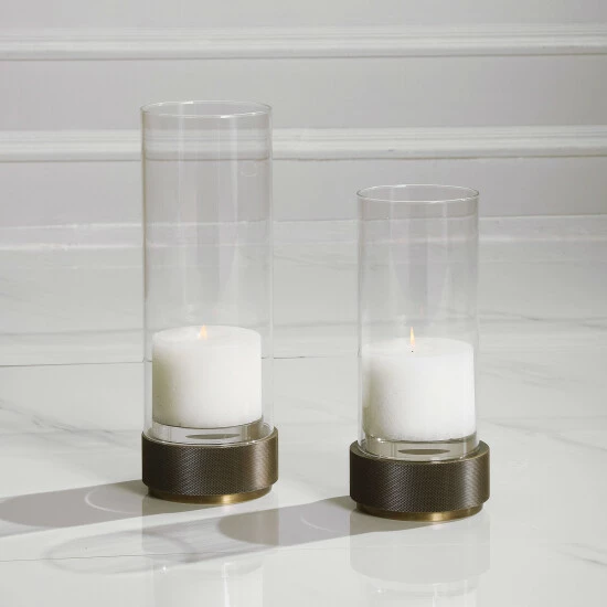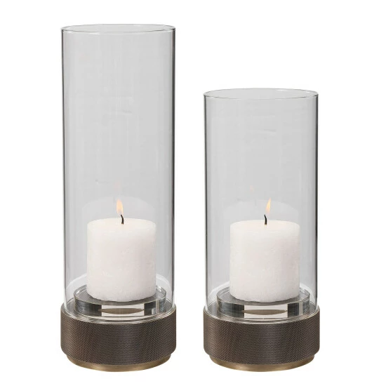 Sophisticated and traditional, these candleholders feature an iron base finished in antique brushed brass, accented by crystal details and a clear glass hurricane.