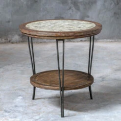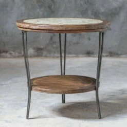 Rustic, mixed media styling with mango wood in a vineyard fruitwood finish, inset with a hammered sheet metal top in heavily aged ivory and grey, with industrial finished iron legs.