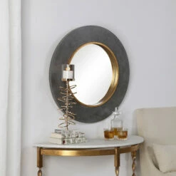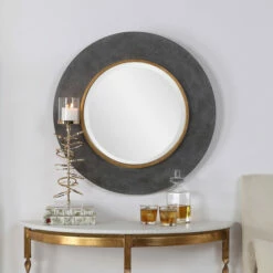 This round mirror features a sleek, solid wood constructed outer frame that’s finished in mottled charcoal concrete look, accented with a raised antique gold inner ledge. The mirror incorporates a 1 inches bevel.