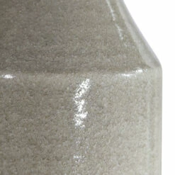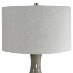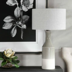 Showcasing a bohemian flair, this ceramic table lamp is finished in a glossy warm grey glaze that transitions to a heavily textured ivory bottom. The hardback drum shade is light grey linen with natural slubbing.